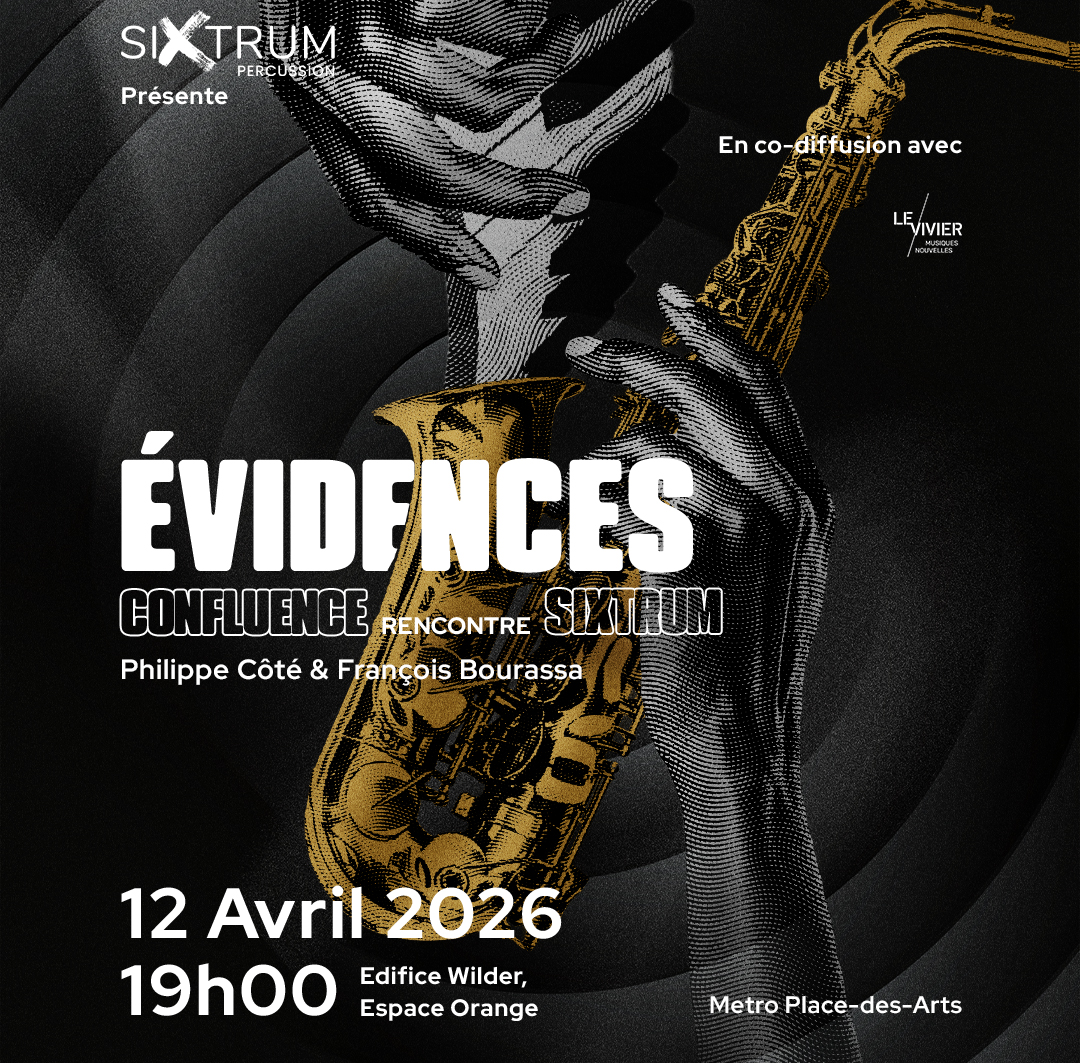 Le saxophoniste Philippe Côté rejoint l’ensemble à percussion Sixtrum et le pianiste François Bourassa pour la création mondiale de nouvelles œuvres qui placent la percussion au centre d’un paysage en constante évolution de rythmes et de textures où l’improvisation se déploie. Inspiré par le projet en duo Confluence (Côté/Bourassa, 2023), ce concert prolonge le dialogue du duo dans une rencontre avec l’univers percussif inventif de Sixtrum.
